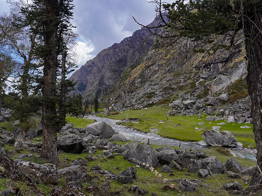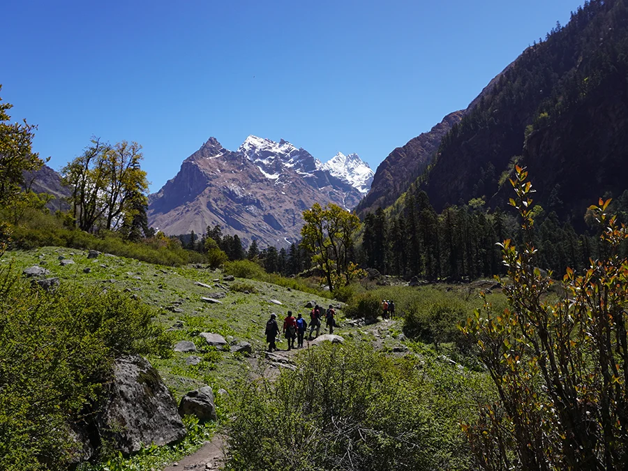 After breakfast, a short drive takes you to Dhatmeer—a picturesque village surrounded by lush valleys. From here, the trek begins as you make your way through forests filled with chirping birds and the soothing sound of the Supin River. The trail is gentle and scenic, gradually leading you deeper into the wilderness. By late afternoon, you’ll reach Pauni Garaat—your riverside campsite for the night. Settle into your tents under a starlit sky, surrounded by the tranquility of nature.